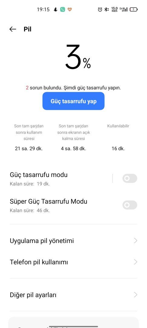 4000 mah bataryalı diğer modellere baktığımızda bu oran daha fazla ve internetten de araştırırsanız 5 saat günlük kullanımda güç tasarruf modu açıkken %40 altına düşmesi hiç normal değil.Ekran açık 5 saat yüzde 40'ın altına inmesi çok çok normal bende Realme 6 Pro var o kadar dayanmıyor.