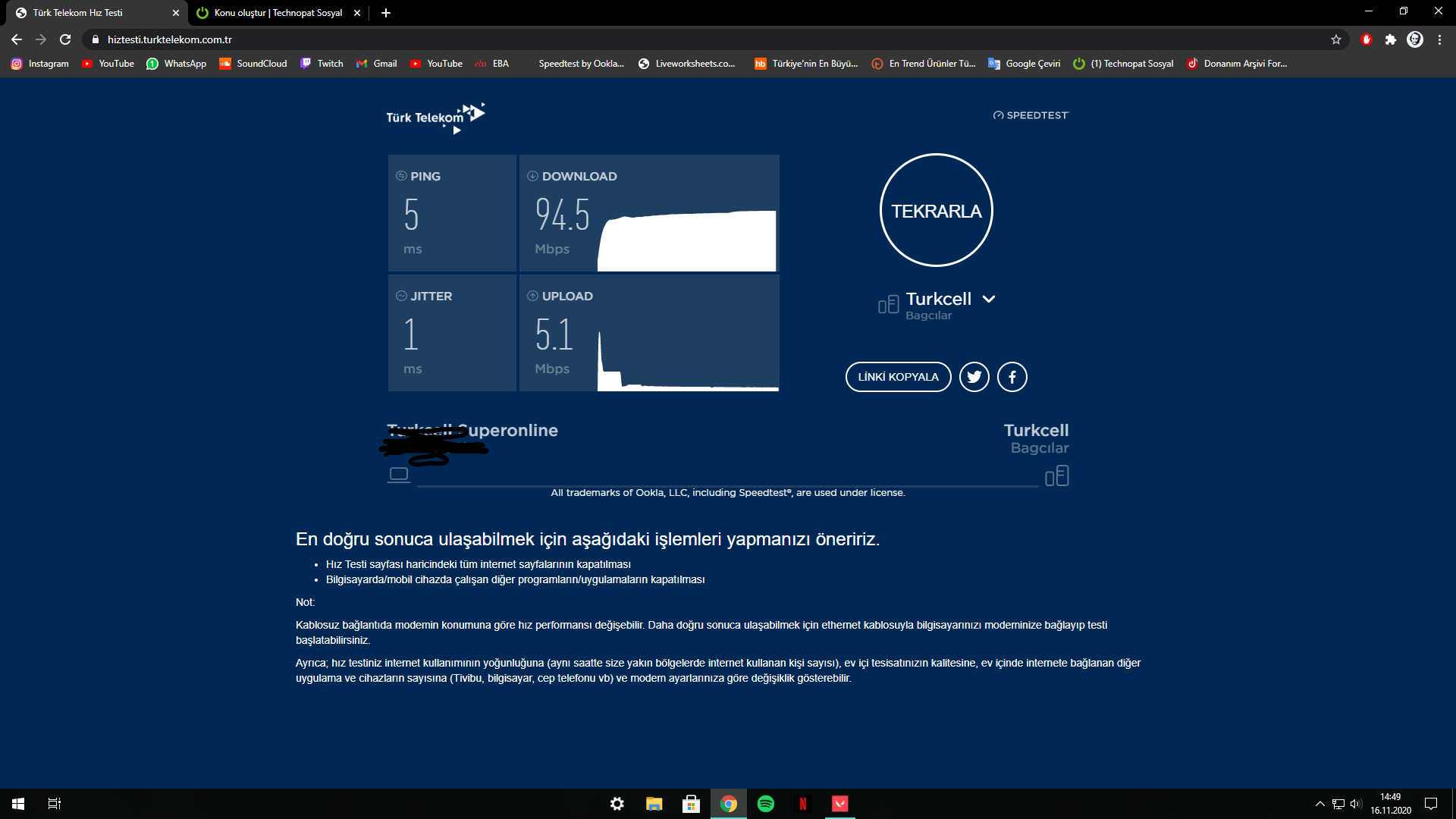 Selam dostlar. Altta belirttiğim gibi birçok Speedtest sonucum buna benzer. Dağıtıcıdan kablo ile kullanıyorum. Modemden kablo çekme şansım ne yazık ki yok. 1 hafta öncesine kadar hızım vb. her şey normal, stabil durumdaydı. Bu hafta bir düşüş olmamasına rağmen oyunlarda ani ping artışı çok yaşıyorum. Zannedersem dağıtıcının yaptığı bir kararsız sinyal alma durumu. Düşünceleriniz nelerdir?