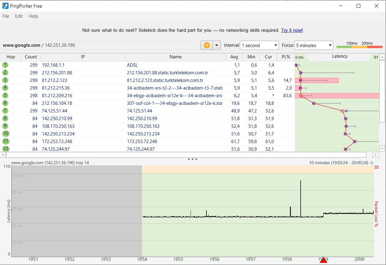 Merhaba arkadaşlar. Lol oynarken arka planda internet hızımda aşırı bir yavaşlama olduğu için lol destek ekibiyle iletişime geçtim. Pingplotter testi yaptık ve sonuçlarda paket kaybı ve ping artışı gözüktüğünü ve bunu internet sağlayıcıma bildirmem gerektiğini söyledi. Türk Telekom'u aramadan önce biraz araştırayım bu işi dedim buraya düştüm. Konuyu açmadan ve Türk Telekomla iletişime geçmeden önce bir de www.google.com'u pingplotter'da açayım dedim. Eğer doğru anladıysam google olan kısımda 5.hopta %83,6 paket kaybı diyor (hoplar ne oluyor en ufak fikrim yok konuları incelerken gördüm). Şimdi ben bunu müşteri hizmetlerine nasıl anlatacağım? Çünkü normal bir kesintiyi anlatırken bile kırk takla atıyoruz anlaşmak için.