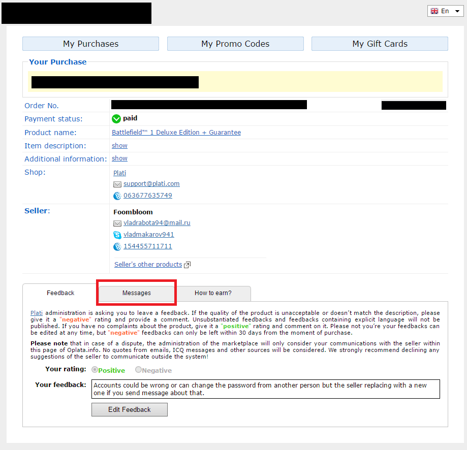 Negative feedback olarak "this is scam, he is always taking back the accounts, don't buy" yazısını büyük harflerle yaz. Adama da "I'll report you to support@plati.com" yaz. Ondan sonra adamdan olumlu bir mesaj gelir zatenZaten GTA 5'i Stem-ya'dan aldım. Şimdide yeni hesap vermiyor.