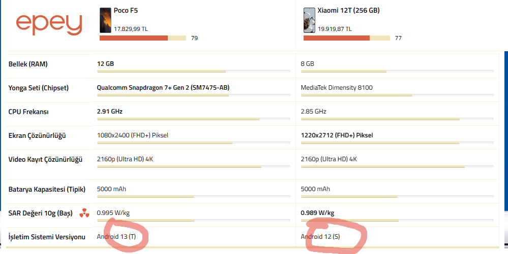 Kamera benim önemli, zaten pek oyun oynamıyorum 12t hayli hayli yeter bana diye düşünüyorumİşaretlediğin yerler cihazların kutudan çıktığı sürüm. Cihazlara gelince POCO F5 kamera hariç genel olarak daha iyi kalite sunan bir cihaz.
