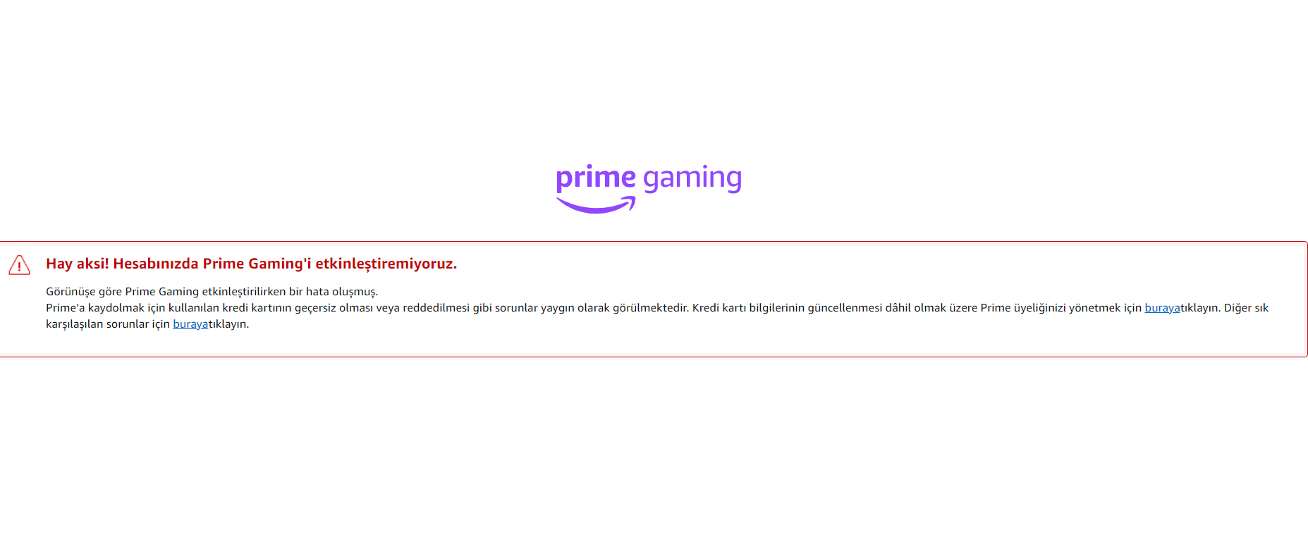 Kartta 2 TL var. Prime Gaming'e girmeye çalıştığımda hep bu gözüküyor.