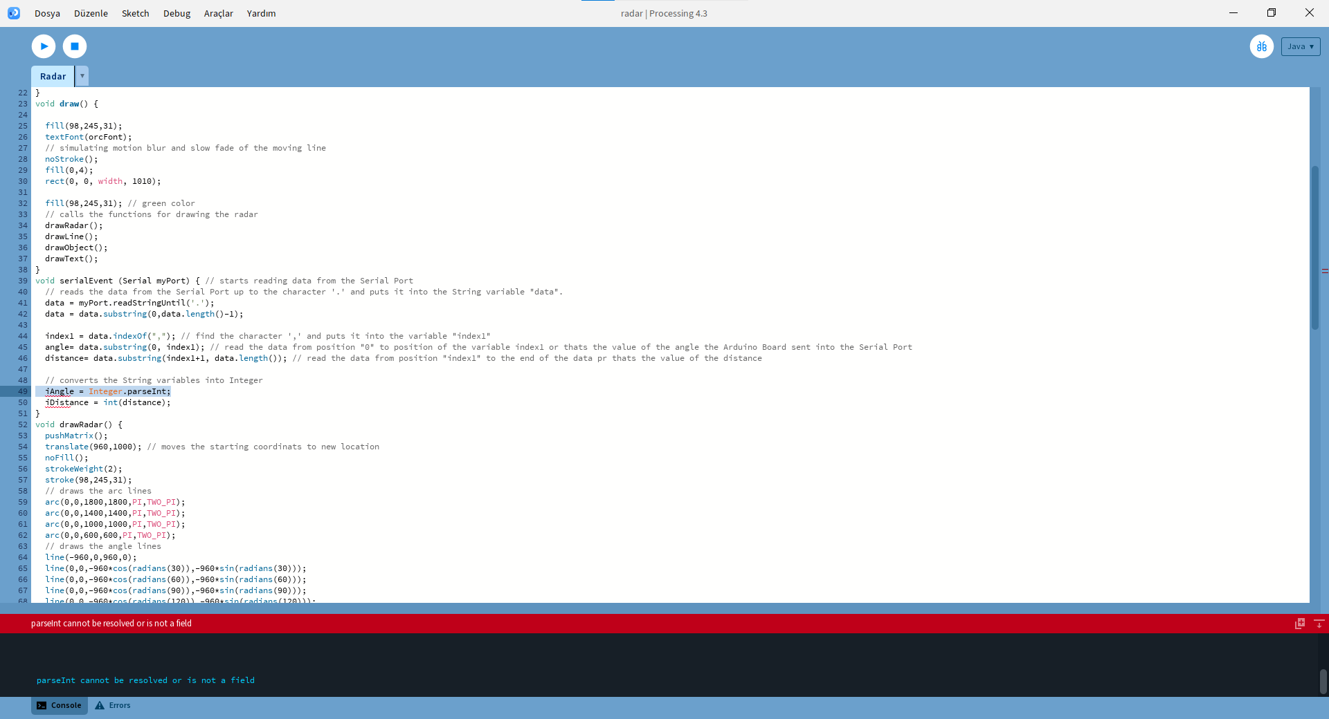 Programlama dersi için Arduino projeleri yapmamızı istediler. Ben de radar yapmaya karar verdim fakat Proccesing'te bu kodu çalıştırdığımda "The function parseİnt(String) does not exist." hatası alıyorum.