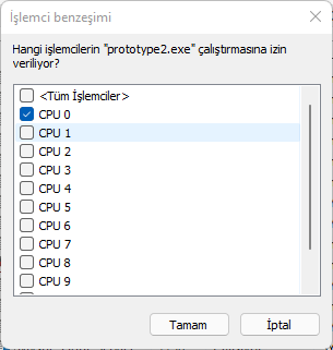 - İlk sırada olan "Tüm işlemciler" kısmının tikini kaldırıyoruz ve sadece "CPU 0"ı tikli bırakıyoruz, yani oyun sadece tek çekirdek kullanacak. Daha sonra "Tamam" deyip çıkıyoruz ve oyunumuza dönüyoruz.