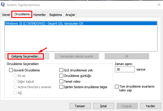 2- Gelen pencerede "Önyükleme" seçeneğine gelip "Gelişmiş Seçenekler" kısmına tıklıyoruz.