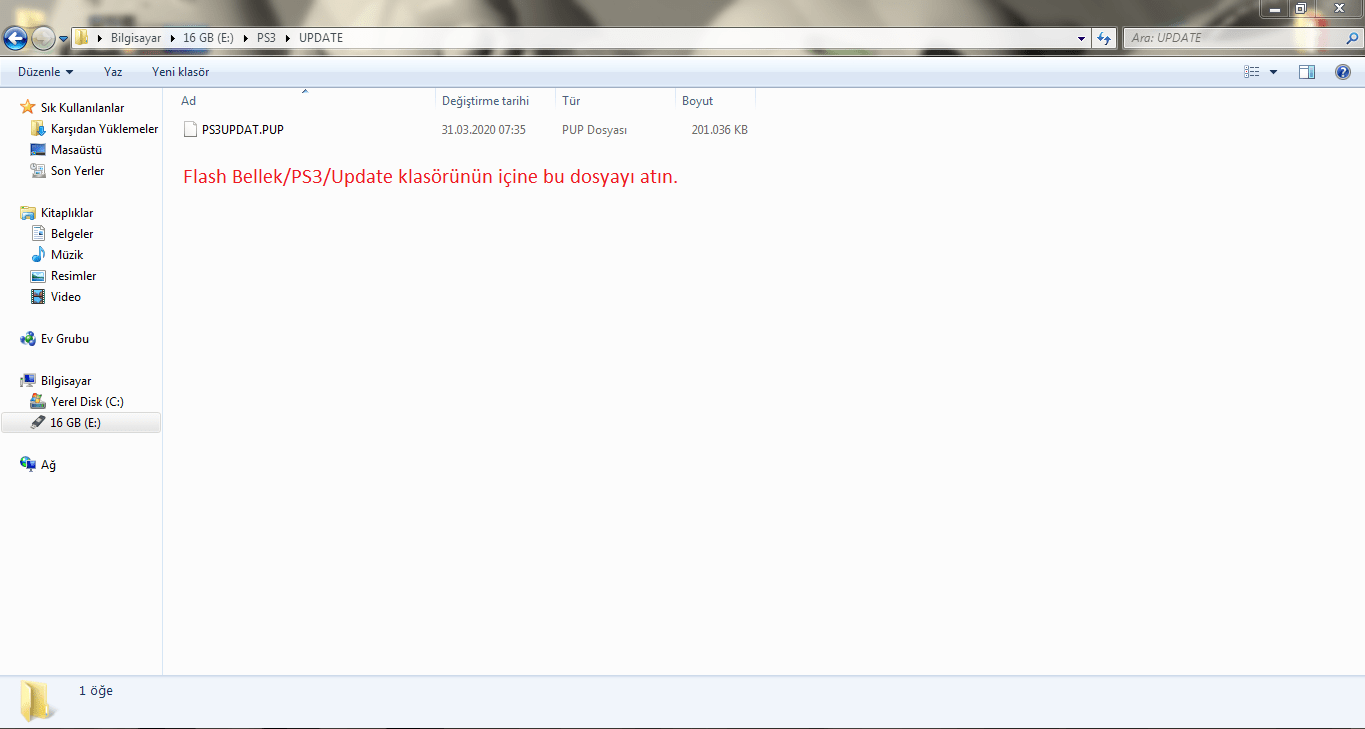 Flash bellek içine büyük harflerle "PS3" isminde bir klasör oluşturun. "PS3" isimli oluşturduğunuz klasörün içine büyük harflerle "Update" isimli bir klasör oluşturun. ZIP uzantılı dosya içerisinden çıkardığınız ve ismini değiştirdiğiniz "PS3updat.PUP" dosyasını flash bellek içerisindeki "Update" klasörünün içine atın.