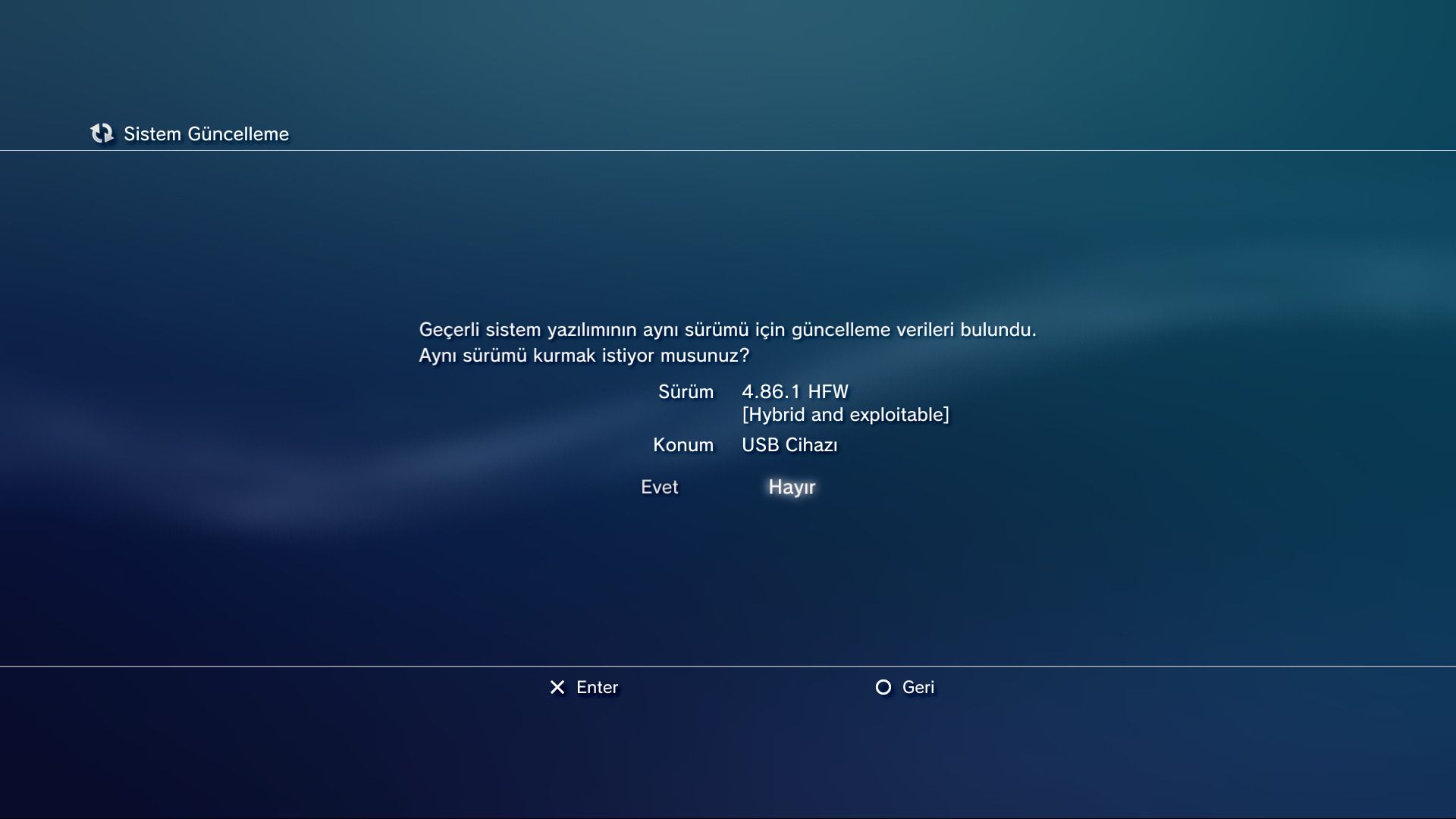 Ardından sürüm kısmını kontrol edelim. Eğer "4.86.1 HFW [Hybrid and exploitable]" yazıyor ise işlemleri doğru yapmışsınız demektir. "evet" tuşuna bastıktan sonra karşınıza kullanıcı sözleşmesi çıkacak. Aşağı kaydırıp "kabul et" seçeneğine basın. Güncelleme işlemi başlayacaktır.