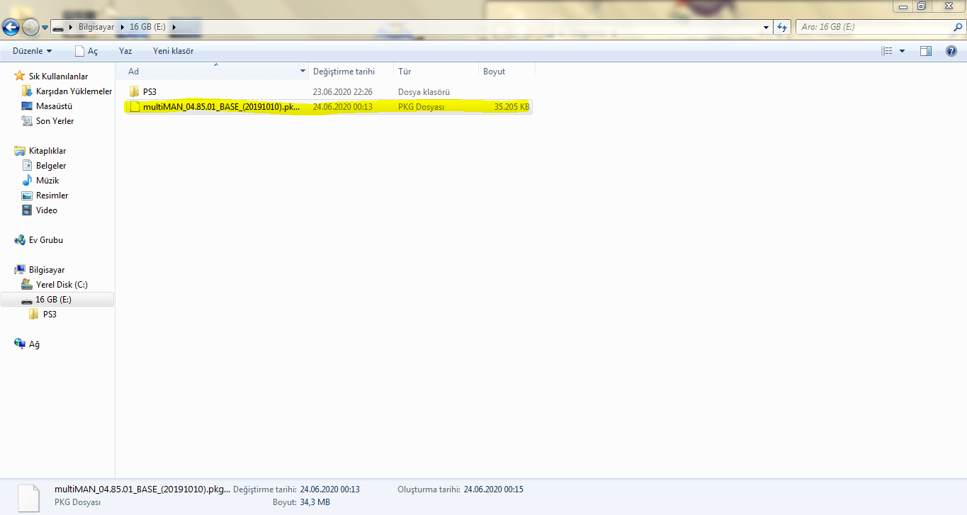 MultiMAN'ın en son sürümünü indirmek için tıklayın. flash belleğinizi bilgisayara takın. İndirdiğiniz pkg uzantılı dosyayı flash belleğin içine atın ve ardından bilgisayardan çıkarıp konsolun sağ portuna takın.