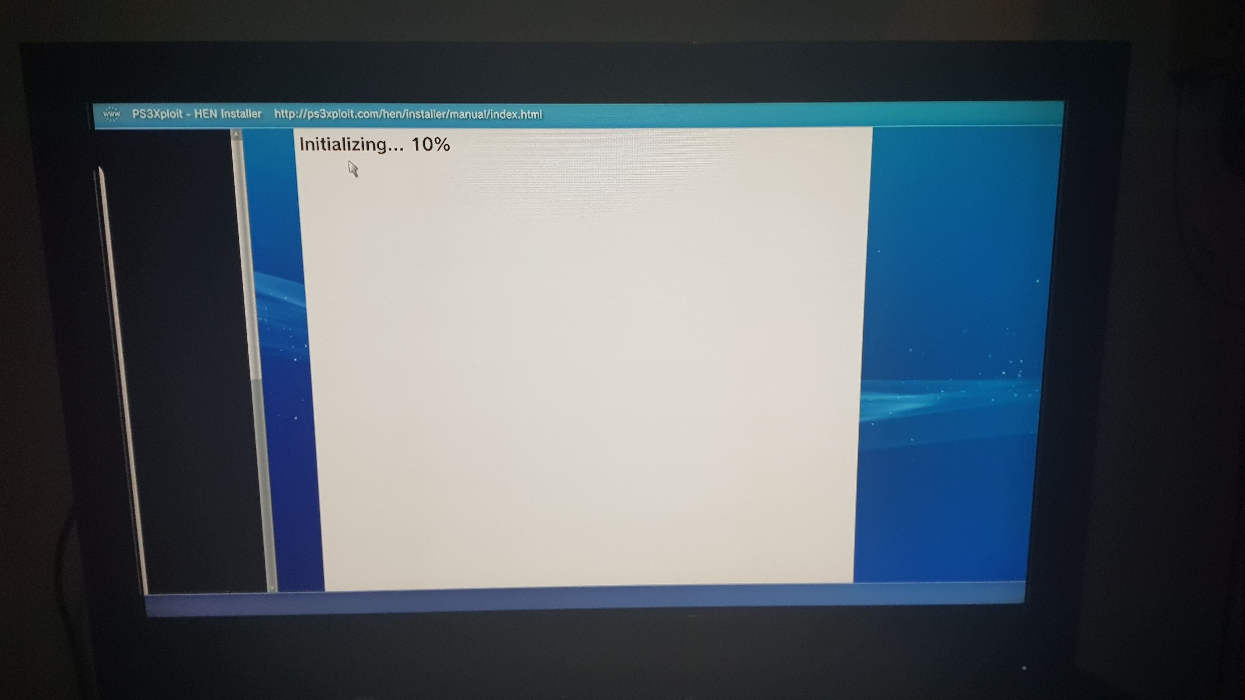 Karşımıza "initializing..." diye bir yazı çıkıyor. İşlem tamamlanana kadar bekleyelim. Eğer "exploit initialization failed" hatası alırsanız kumandadan üçgen tuşuna basın, "araçlar" kısmına girin ve önbelleği, çerezleri, arama geçmişini ve kimlik doğrulama bilgilerini silip "yenile" tuşundan sayfayı yenileyin ve işlemin tamamlanmasını bekleyin. Eğer birkaç defa aynı hatayı aldıysanız konsolu yeniden başlatıp tarayıcıda yaptığımız işlemleri tekrarlayın.