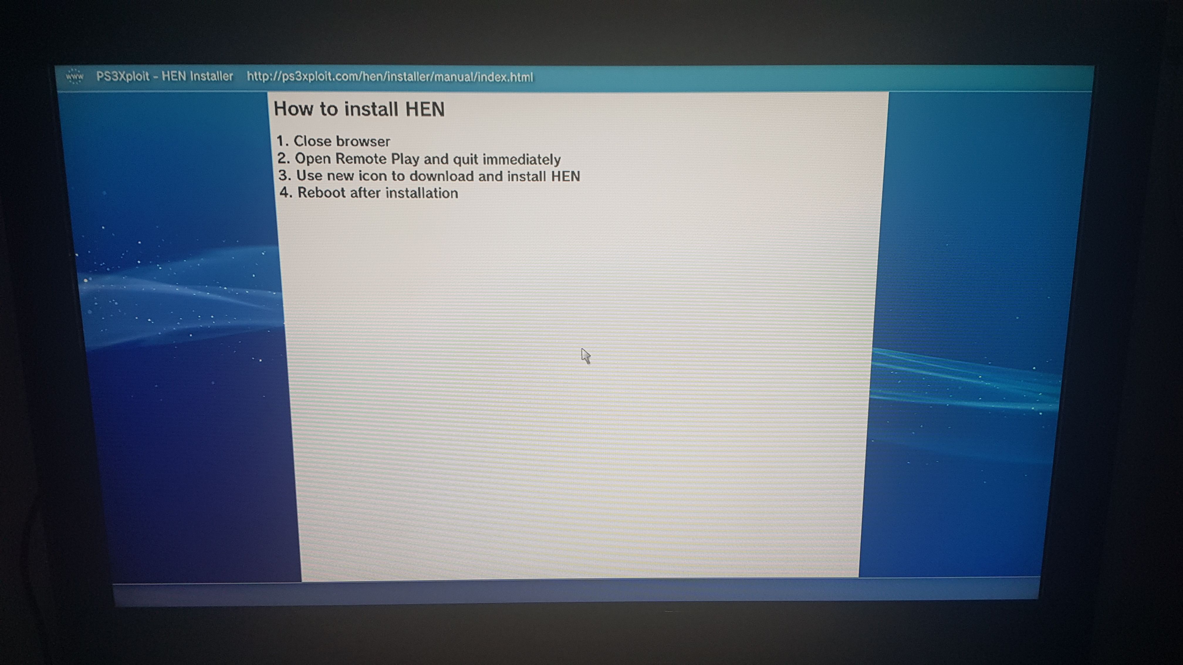 Eğer karşınıza resimdeki gibi "how to install hen" yazısı çıktıysa işlem başarılı olmuş demektir. Şimdi tarayıcıdan çıkın ve "ağ" kısmındaki "uzaktan oynatma" kısmına girin ve daire tuşu ile geri çıkın.
