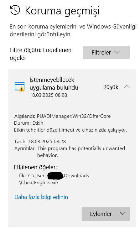 PUADIManager:Win32/OfferCore adında bir yazılım bulundu diyor ama Kaspersky ile tam tarama yaptığım zaman hiçbir şey gözükmüyor. Attığım fotoğraftaki gibi Cheat Engine'in içinde bulunmuş ama ben Cheat Engine kendi sitesinden indirdim.