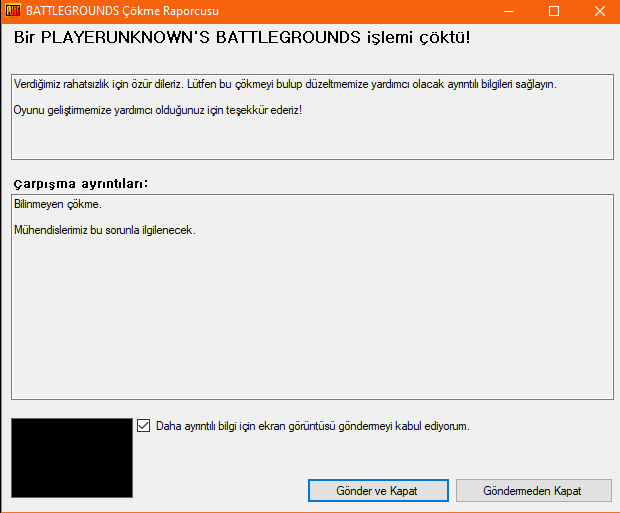 PUBG çökme hatası