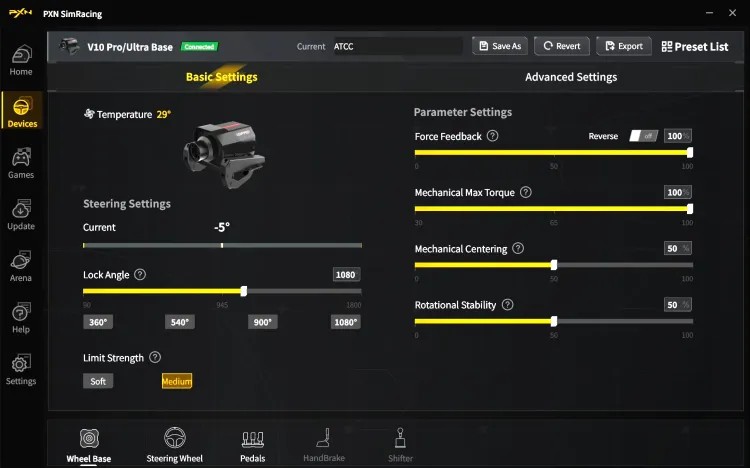 -Direct Drive setlerde dönüş açısı sınırsızdır hocam. Yazılımsal olarak 1800 dereceye kadar dönüş açısı mevcuttur. Bu da gerçek kamyon direksiyonlarındaki tam tur dönüş açısını karşılar. Yine PXN SimRacing uygulaması ile 270,540,,900 veya 1080 dereceye kilitleyip kullanabilirsiniz. Önceki Dişli V10 modelinde bu iş için base arkasında bir tuş vardı. V10 Pro'da PXN'in yeni SimRacing uygulaması üzerinden FFB, Inertia, dönüş açısı gibi ayarlar yapılabiliyor.