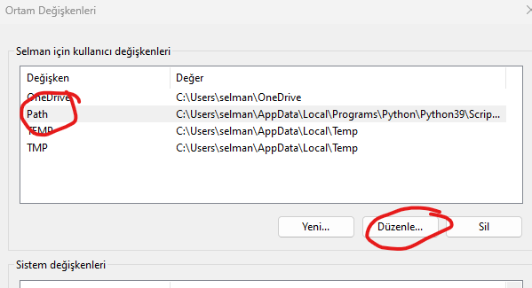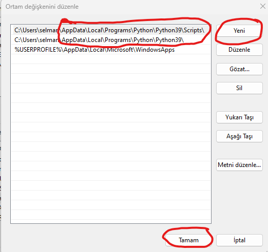 Python yolunu ve Scripts yolunu bu şekilde yazıp Tamam'a basın. En son Uygula basıp CMD'ye tekrar girin. pip yazın ve enterleyin.