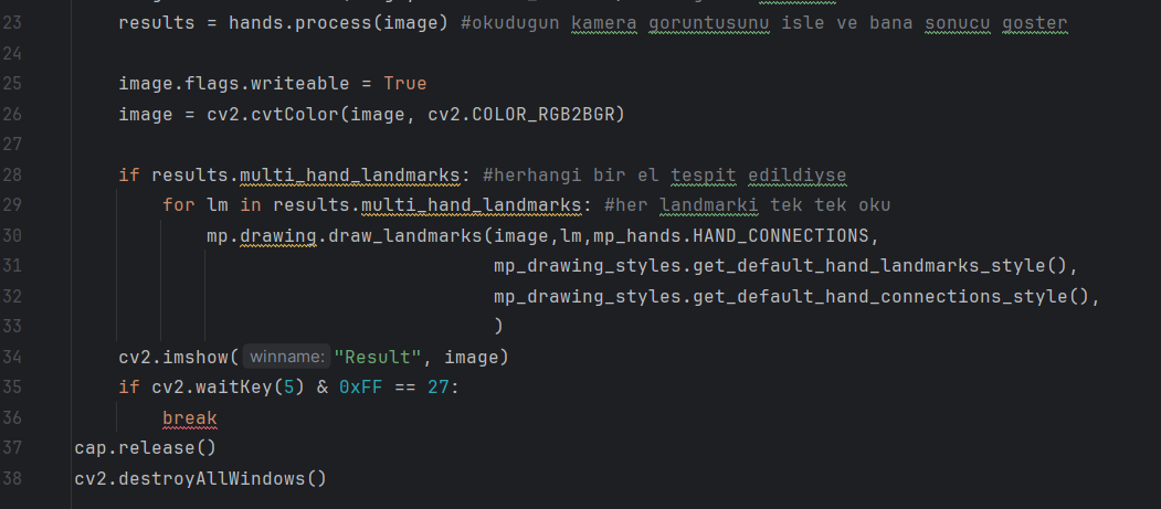 results = hands.process(image) #okudugun kamera goruntusunu isle ve bana sonucu goster.