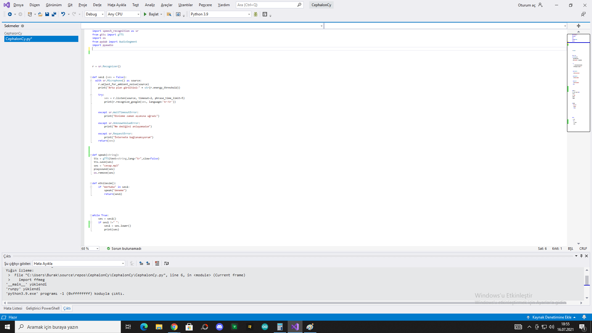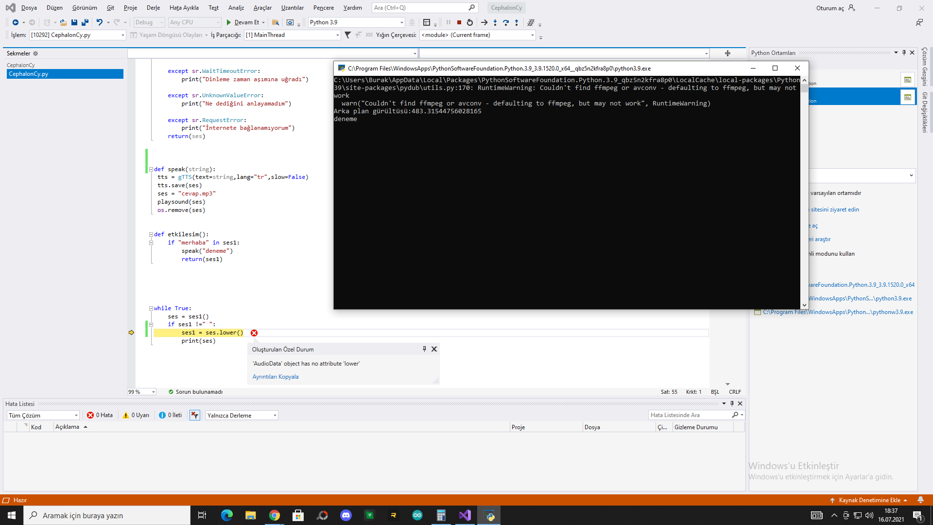 pip install ffmpegpython -m pip install ffmpeg deneyin.Kodların tamamını at.Merhabalar uzun süredir Python'da sesli asistan uygulaması yapmaya çalışıyorum ancak ifadenin içindeki string ifadeyi küçük yazdırmam gerek değişkenin sonuna. Lower koyuyorum ama hata veriyor. Bunun sebebi nedir?