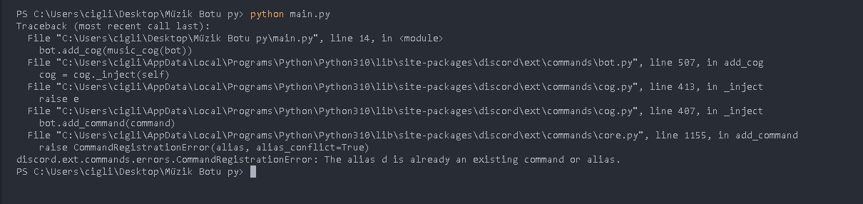 Python ile Discord müzik botu yapıyordum ama bu hataları aldım. Sizce sorun nedir?