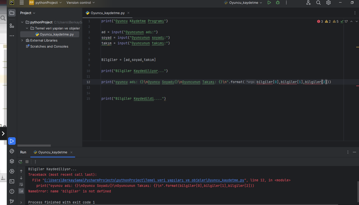 Merhaba, Python oğrenmeye yeni başladım. Böyle bir kucuk kod yazdım fakat hata verdi, sebebi nedir? Bilgiler diye bir liste oluşturmaya calıştım fakat hata verdi bende yeni bir yere a = [2,4,5] diye liste oluşturdum. Bu sefer oldu fakat aynı listeyi değiştrip isim girdiğimde yine hata verdi.