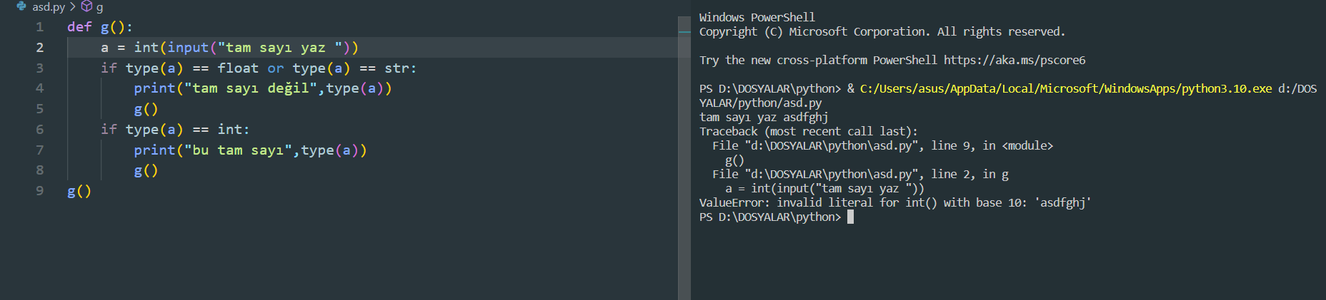 print("tam sayı değil",type(a))