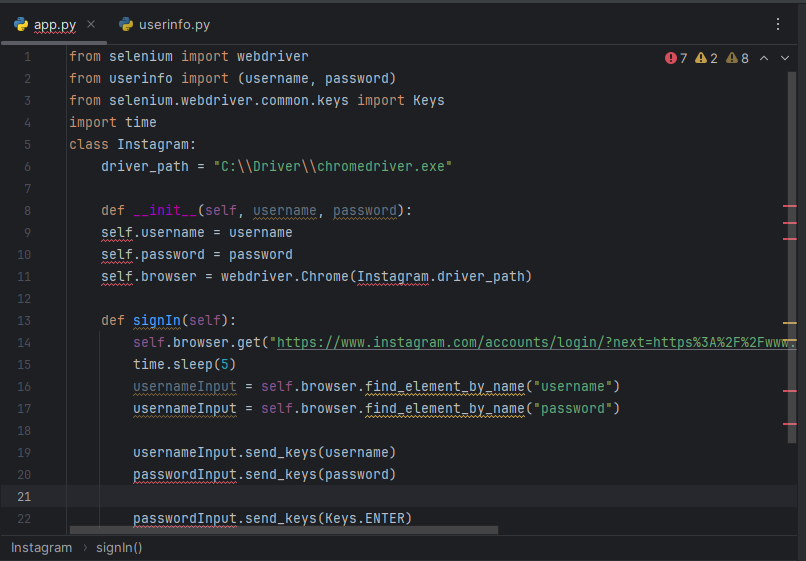 Kod:def __init__(self, username, password): self.username = username self.password = password self.browser = webdriver.Chrome(Instagram.driver_path)