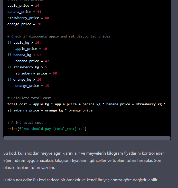 In this task you will create the Python file on VS Code with named “Name_Surname_PythonTask02.py” and write your Python script and finally upload your created file on lms. You are practice about following concepts: Conditional execution, comparison operators, boolean expressions, scope of the block, ıf, else and Elif statement, nested decisions statement, and also previous weeks topics like variables, types, assignment, expression, Print(), Type() and Input() methods. Note: Notice that you are expected to submit a single python file. Make sure that you include your code for all four steps in a single .py file. 1. Write python script that will calculate the total amount of money a customer should pay at a grocery store according to the prices given as follows: 1 kg of apples is 14 TL, 1 kg of bananas is 44 TL, 1 kg of strawberries is 60 TL and 1 kg of oranges is 20 TL. If the customer wants to buy more than 10 kilos of each item, able to get the following discounts.