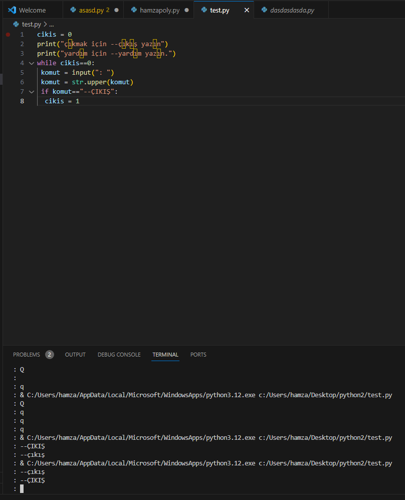 Çok teşekkür ederim bu sefer çalıştı, terminal de sıkıntı var herhalde. Ama hala komut = str.upper(komut) if komut=="--ÇIKIŞ":