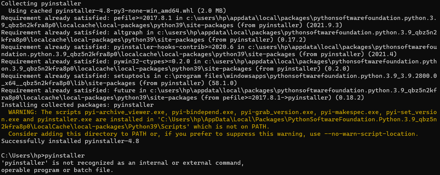 (Güncelleme) 'pip uninstall pyinstaller' sonrada 'pip install pyinstaller' yazdım bu sefer sanırım kurabildim ama .py'ı .Exe'ye çevirmek için CMD'ye alttaki kodu yazdım ve "pyinstaller is not recognized" hatası aldım.