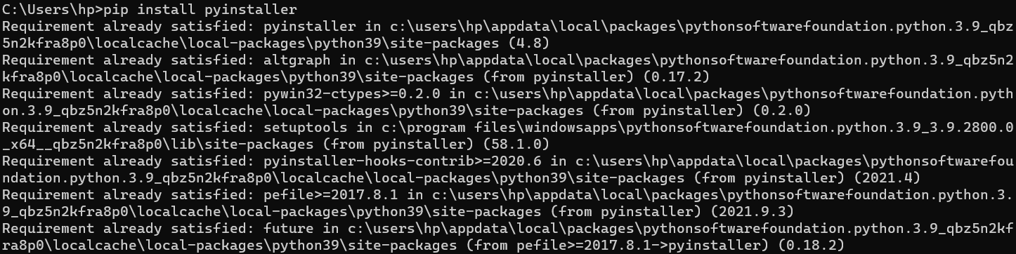 .py olan bir dosyayı .Exe'ye çevirmek istiyordum ve pyinstaller ile çevirmek istediğimden ama pyinstaller kurulu olmadığından CMD'ye 'pip install pyinstaller' yazdım ama görseldeki gibi yazıları alıyorum pyinstaller'ın kurulu olmadığına eminim ancak yazılardan anladığım kadarıyla pyinstaller'ın halihazırda indirildiğini söylüyor. Nasıl çözeceğim?