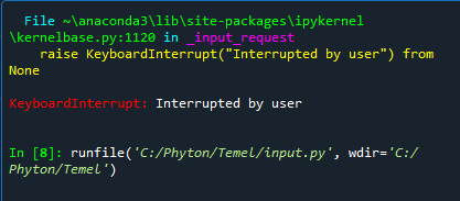 Kodu da atabilir misin?Python öğreniyorum ve yeni başladım. Konu inputlara gelince izlediğim adamın aynısını yazdım ama çalışmadı. Görseldeki hatayı alıyorum ne yaparsam değişmedi sadece anconda Spyder'dan input komutu çalıştırıyorum.