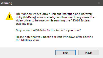 AIDA64 uygulamasını indirip işlemciyi sıcaklık testine sokmak istedim. İşlemciyi teste sokmak isterken orada GPU seçeneğini görünce ekran kartını da test edeyim dedim ve önüme bir uyarı çıktı. Görsel olarak ekledim. Sizce sorunun nedeni bu olabilir mi? Benim bildiğim ekran kartının gerektirdiği güncelleme GeForce uygulaması üzerinden yapılıyor. Windows video driver diye bir şey olduğunu bilmiyordum.