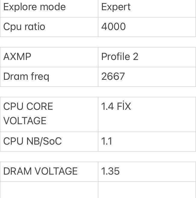 Stok soğutucu için 1.4 fazla olacaktır, sanırım stok soğutucu kullanıyordunuz. Varsayılan ayarlara aldığınızda herhangi bir sıkıntı oluşmuyorsa, overclock ayarlarınızı güncellemeniz gerekiyor. Voltajı yavaş yavaş azaltarak mesela.