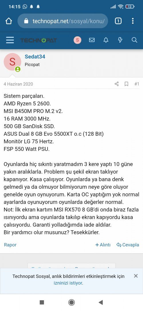 Anladım instadan paslasiriz burdan da olur.haberleselimHocam sistem boştayken takılıp restart atıyor fakat oyun oynarken hiçbir sıkıntı yok. Sistemim imzadaki sistem.