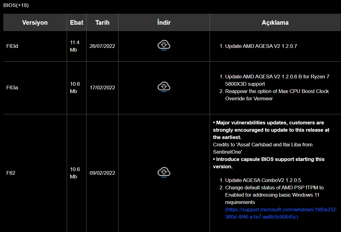 Ayrıca üstte de denildiği gibi önce BIOS'u güncelleyebilirsiniz. Sonunda harf olan sürümler beta BIOS oluyor. Onlar değil de en azından F62'yi yükleyebilirsiniz, güncelleme notlarında "major vulnerabilities" yani önemli iyileştirmeler/çözümler olduğunu belirterek paylaşmışlar. İsterseniz son sürüme yani F63d'ye de güncelleyebilirsiniz ama beta BIOS olduğunu belirtmekte fayda var.