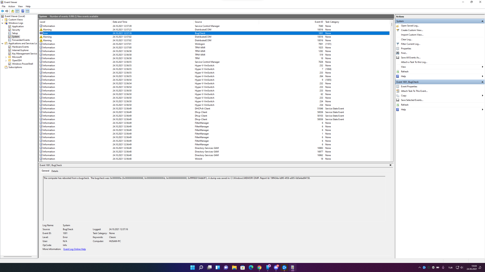 "The Computer has rebooted from a bugcheck. The bugcheck was: 0x0000000a (0x0000000000000068, 0x000000000000000d, 0x0000000000000000, 0xfffff800104db0f1). a dump was saved in: C:\Windows\MEMORY.DMP. report ID: 19FF434A-B8F0-4F36-A005-0D3e4ad94158."