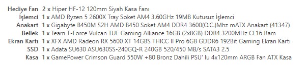 Önceki işlemcim Ryzen 5 2600X ve ekran kartım XFX 5600XT markasıydı. Diğer bileşenler ekli fotoda olduğu gibidir.