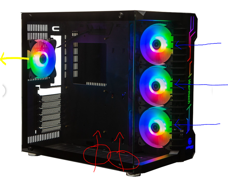 Fanlar bu şekilde olması gerekir değil mi? Kasayı aldıktan sonra hiç yönlerini değiştirmedim. Kırmızı yuvarlakların olduğu yerde de 2 tane fan mevcut. 2 ay olmuştur bu kasayı satın alalı çok memnunum görüntü açısından fakat ciddi anlamda sıcaklığı içeride tutuyor. Üst tarafa da fan koysam 2 tane dışarıya atacak şekilde soruna yardımcı olur mu?