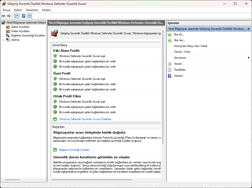 Bir kuralla eşleşmeyen bağlantılara izin ver seçenekleri devre dışıydı, üç profil için de etkinleştirdim ama bir değişim olmadı üstüne de Windows bu ayarlar güvenli değil şeklinde hata vermeye başladı ve güvenlik duvarını kapalı olarak algılıyor :/