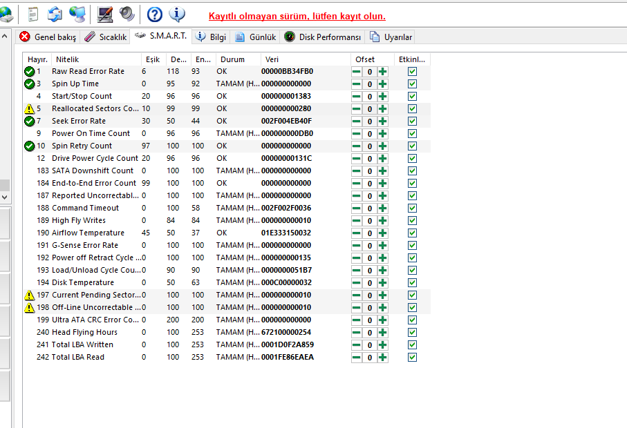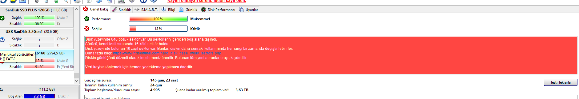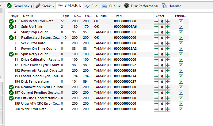 Disklerine HD Tune yazılımı ile "error scan" testi yap ve "health" sekmesini paylaş. HD Sentinel yazılımı ile sağlık derecelerini ve S.M.A.R.T verilerini paylaş.