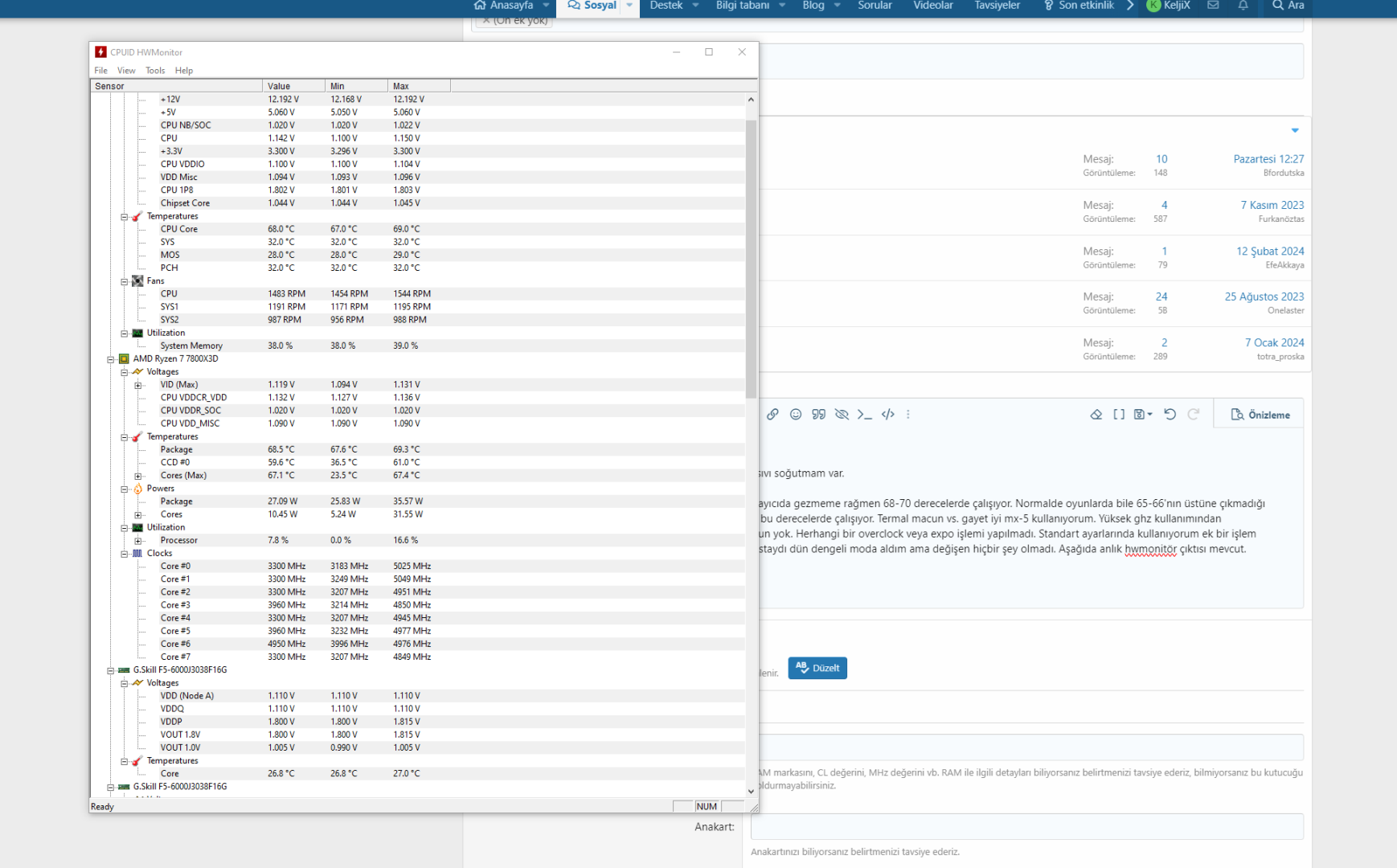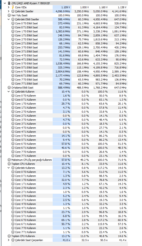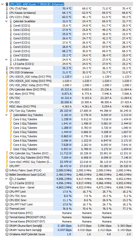 İşlemcim gereksiz yüksek GHz'lerde çalışıyor ve sadece tarayıcıda gezmeme rağmen 68-70 derecelerde çalışıyor. Normalde oyunlarda bile 65-66'nın üstüne çıkmadığı halde normal kullanımda sadece masaüstünde bile olsam bu derecelerde çalışıyor. Termal macun vs. gayet iyi MX-5 kullanıyorum. Yüksek GHz kullanımından kaynaklandığını düşünüyorum çünkü oyunlarda hiçbir sorun yok. Herhangi bir overclock veya EXPO işlemi yapılmadı. Standart ayarlarında kullanıyorum ek bir işlem yapmadım. Windows güç seçeneklerinde nihai performanstaydı dün dengeli moda aldım ama değişen hiçbir şey olmadı. Arka planda işlemciyi yoracak hiçbir uygulama aktif değil zaten utilization kısmından işlemci kullanımının olmadığını bile görebilirsiniz. Maksimum %16.6 görmüş o da anlık. Aşağıda anlık HWMonitor çıktısı mevcut. Sadece yardımcı olmak isteyen arkadaşlar yazarsa sevinirim. Buraya yazdıklarımı göre göre aynı soruları tekrar soracak kişiler hiç yazmasın. Yoruldum onlardan.