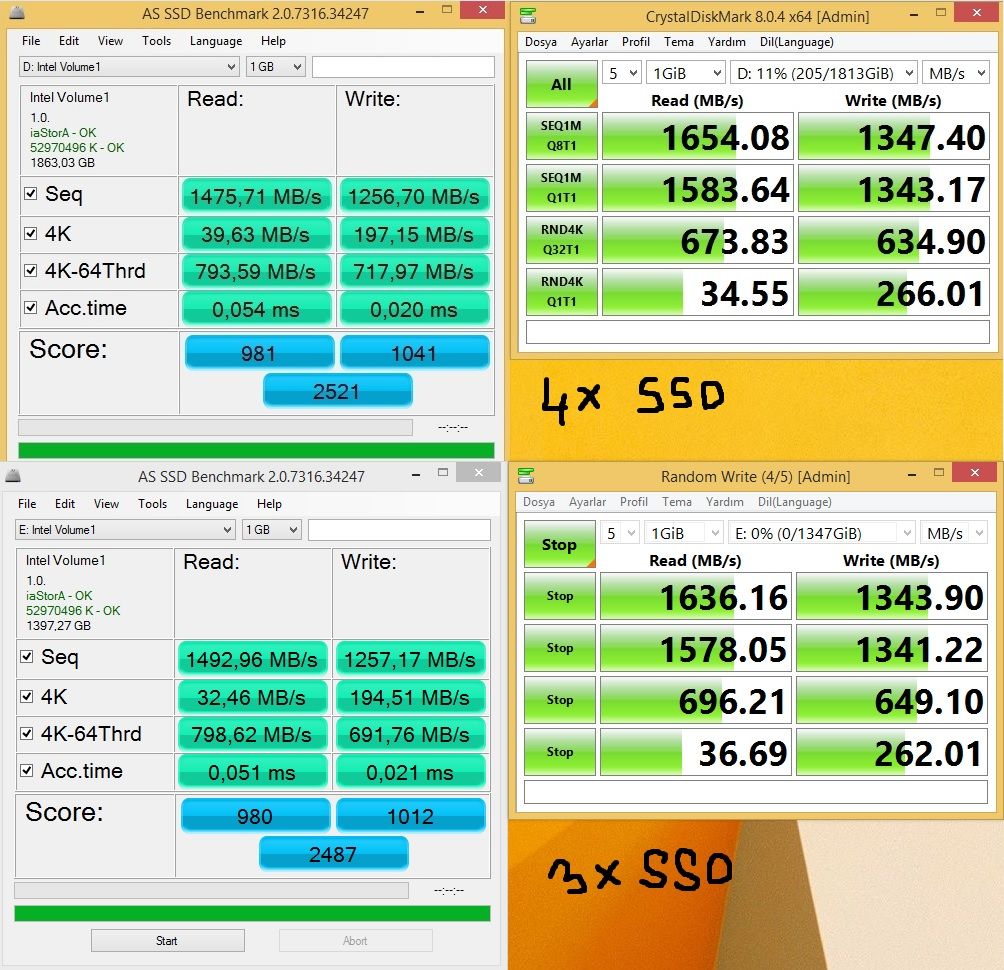 Selam. Görselde 3 adet disk ile 4 adet SATA diskin RAID kurulumundaki performans sonuçları paylaşılmıştır. Sonuçlarda disk sayısı artmasına rağmen performans artışı görülmemektedir, neden?