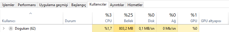 Görev yöneticisinde 1GB RAM kullanmamasına rağmen %25 kullanılıyor gösteriyor.