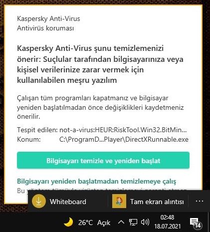 Tam tarama yapıyor şu anda Kaspersky. Mining zararlısı nedir bilmiyorum tam tarama biraz sürecek gibi. Fakat uzantısında "not a virus" yazan bir şey olmasi beni oldukca tedirgin etti. Tam taramadan sonra tekrar bilgi verecegim. Bu arada masaüstünde bir belge falan cıkmadı. Ekstra bir şey goremiyorum. Görev yoneticisinde gozume carpan bir seyde yok su anda.