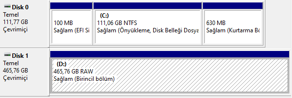 Sabah USB ile laptobu formatladım. C diskini biçimlendirip Windowsu oraya kurdum. Daha sonra D diskine gittiğimde biçimlendirme gerekiyor gibisinden hata aldım ve biçimlendire bastığımda biçimlendirme yapamadı. Disk yöneticinden de D diski RAW olarak görünüyor. Şuan D diskine hiçbir müdahalede bulunamıyorum.