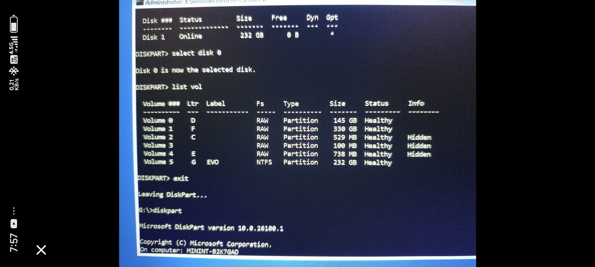 Komut satırından girip diskpart ile diskleri listelediğimde NVMe M.2 SSD diski "RAW" hale gelmiş. Harici takılı SSD ise aktif vaziyette. (bknz. Ekteki resim)