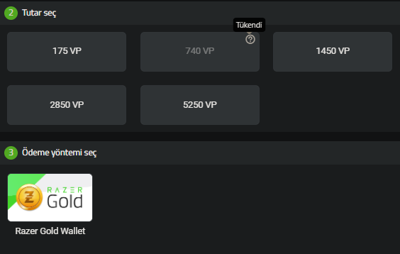 Bu durumda Razer Gold puanlarınızla Valorant VP satın alabilmeniz için, stokların yenilenmesini beklemeniz gerekmektedir. Ki stoklar da yenilenmiş gibi gözüküyor (740 VP hariç) resmi site içerisinde.