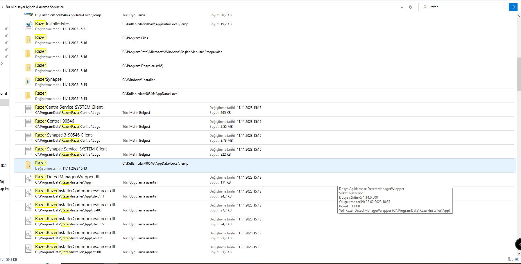 5- Razer'ın dosyalarını yüklediği yolu bulun ve Razer dosyasını tamamen silin.( burada kullanıldığı için silinemiyor uyarısı geliyorsa razer'e bağlı tüm hizmetleri sonlandırın. C:\Program Files (x86)\Razer\Razer Services\GMS içerisindeki uninstallerı kullanın.)