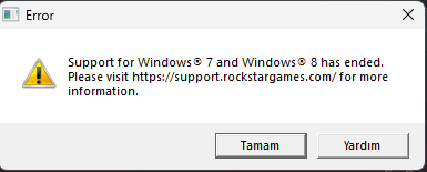 Bende o hata gitti şimdi de başka hata vermeye başladı Windows 7 8 desteklemiyor hatası alıyorum ama Windows 11 kullanıyorum, diğer tüm Rockstar oyunlarını oynadım bu PC de sorunsuz. Ekran resimlerini bıraktım, var mı çaresini bilen 2 gündür işten gelince kafa dağıtayım diyorum daha fazla strese girdim.