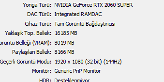 Sistemim, oyun için görüntüler ve ayarlar şu şekilde: