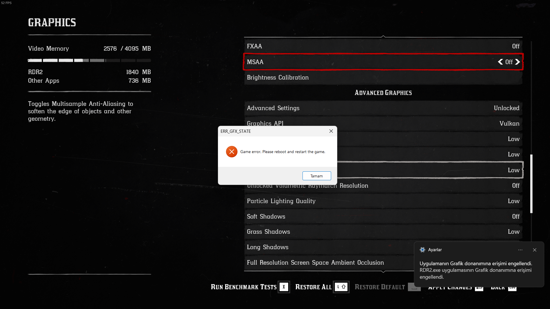 Oyuna daha giriş bile yapamadım maalesef her yerde araştırdım çözümünü bulamadım. Oyundaki seslerde acayip bir cızırtı mevcut bütün ayarları Low ayarlara çekmeme rağmen 30 FPS alıyorum oyunda ayrıyeten aşağıdaki görseldeki hatayı verip atıyor.
