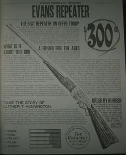 Evans repeater benim şimdiye kadar hiç denemediğim bir tüfek, pek tüfek kullanmam zaten. Fiyatı oldukça tuzlu, 300 dolar. Özellik olarak ise pek iyi değil. Asıl iyi yöne 26 mermi taşıması. Yani mermi doldurmakla pek uğraşmayacaksınız. Benim puanım 10/4 tabii bunda hiç denememiş olmamda var ama bu fiyatı bence hak etmez. Statlar görseldeki gibi.